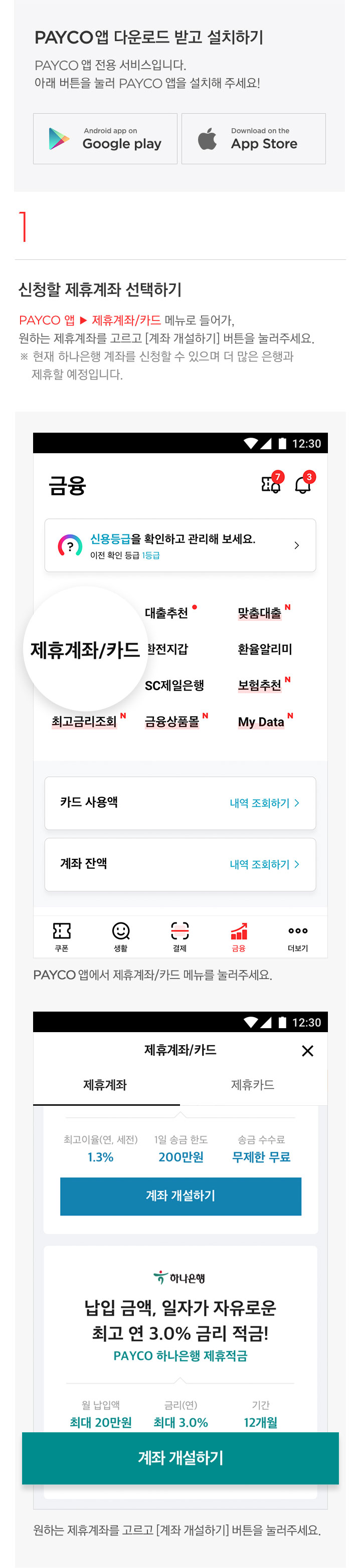 PAYCO 앱 > 제휴계좌/카드 메뉴로 들어가, 원하는 계좌를 고르고 [계좌 개설하기] 버튼을 눌러주세요.