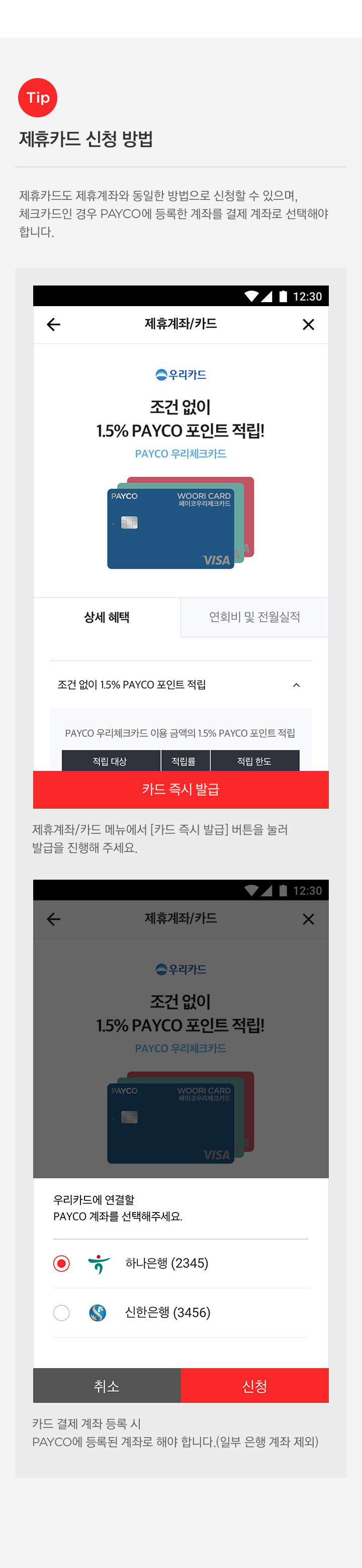 PAYCO 제휴계좌/제휴카드는 PAYCO 앱에서 신청할 수 있습니다.